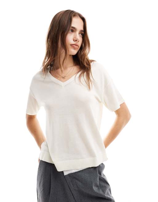 Vila - Strikket top med V-hals i cremehvid