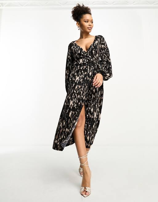 Vila - Tekstureret midikjole med slå-om-detalje foran og abstrakt print i sort og brun