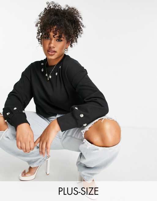 Violet Romance Plus - Sort sweatshirt udsmykket med perleblomster