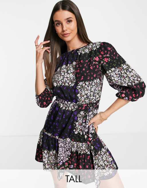 Violet Romance Tall - Minikjole med bindebånd i taljen og patchwork-design med blomstermønster