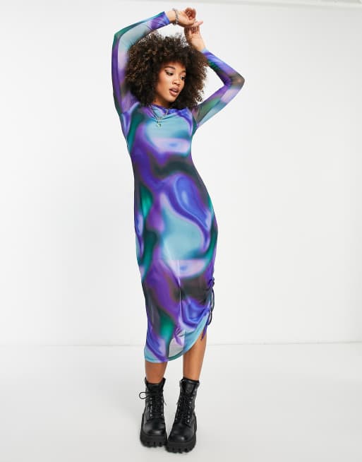 Violet Romance - Midikjole med marmorprint og rynker og bindebånd i siderne i mesh