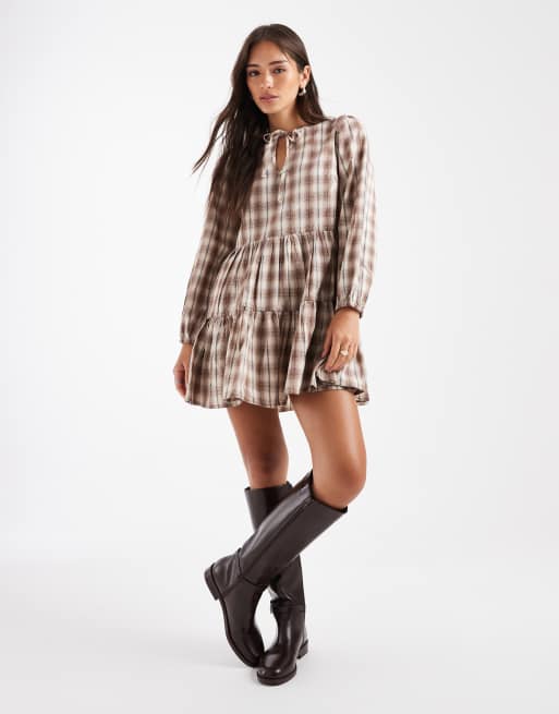 Wednesday's Girl - Beige smock-minikjole med bindedetalje og tern