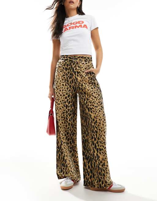 Wednesday's Girl - Lysebrune bukser i twill med vide ben og leopardprint