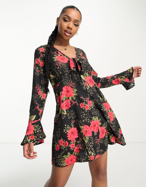 Wednesday's Girl - Minikjole med V-hals og flæser i roseprint