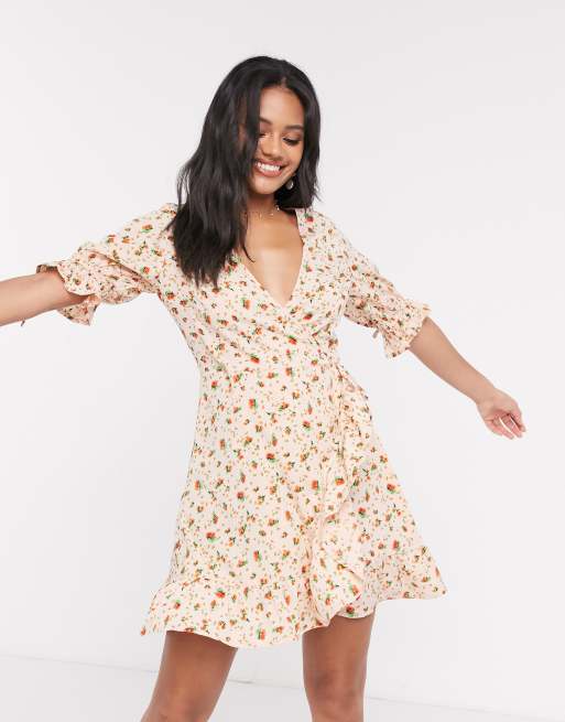 Wednesday's Girl - Småblomstret slå-om-minikjole med bindebånd ved ærmer