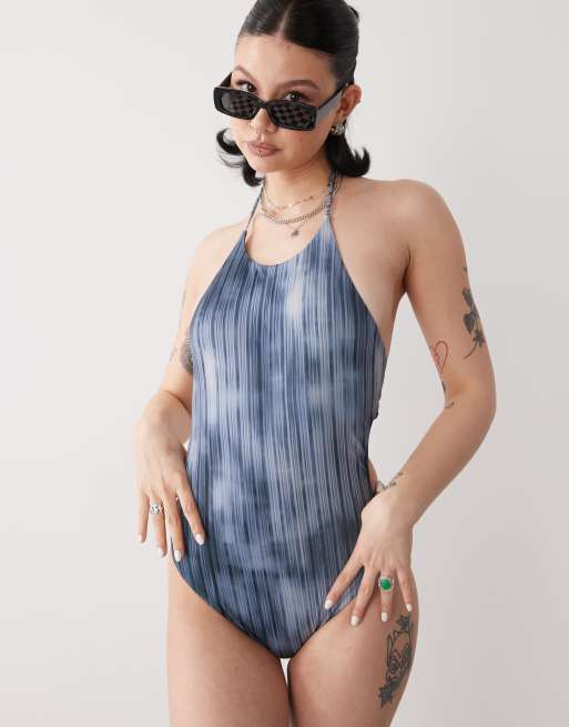 Weekday - Blå badedragt med halterneck, åben ryg, bindebåndsdetalje og striber