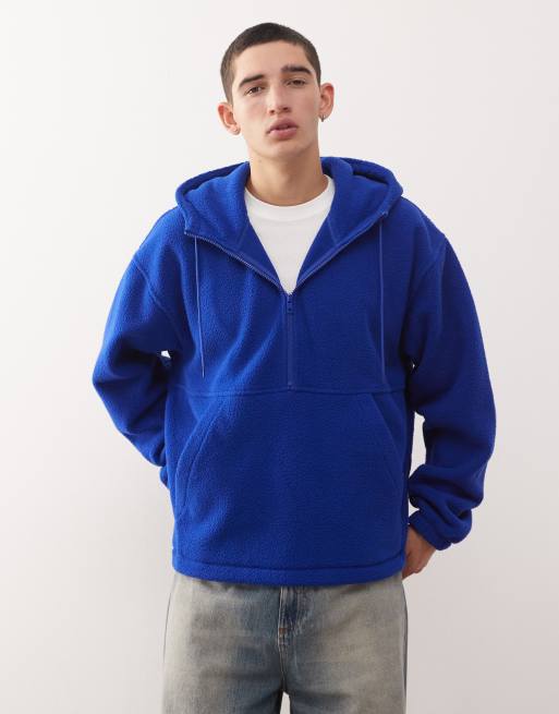 Weekday - Blå hættetrøje i fleece med kort lynlås og elastisk sømkant