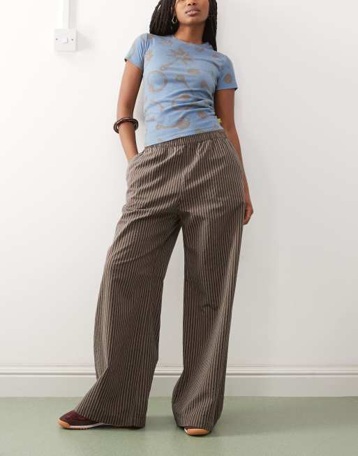 Weekday - Brune bukser i bomuld med brede ben og løbesnor og striber