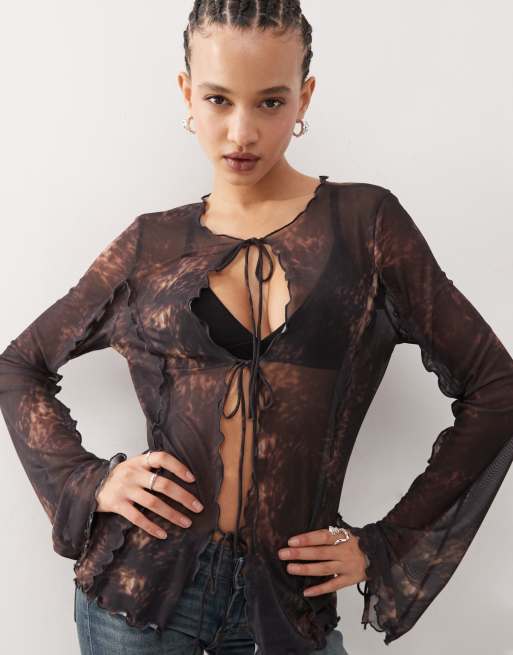 Weekday - Elysia - Langærmet top i sort/bordeauxrød mesh med bindefront og tekstureret print