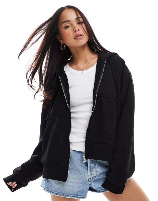 Weekday - Essence - Sort hættetrøje i firkantet pasform med lynlås
