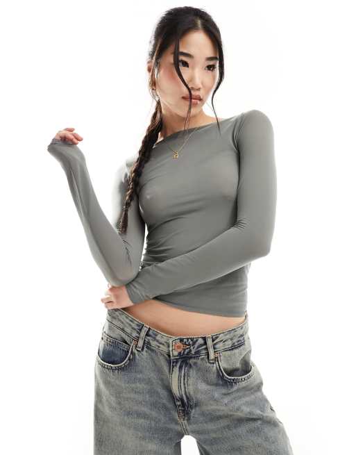 Weekday - Gennemsigtig og langærmet grå top med bådudskæring