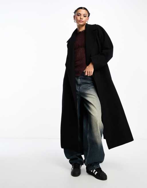 Weekday - Kia - Oversized frakke med bindebånd i taljen i sort uldblanding