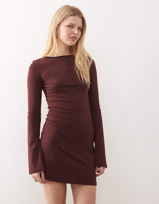 Weekday - Langærmet bordeauxrød minikjole med bådudskæring
