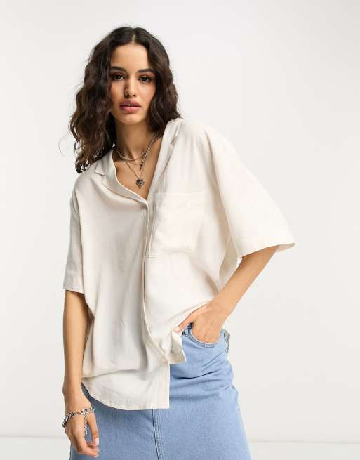 Weekday - Mira - Råhvid bluse med korte ærmer i hørblanding