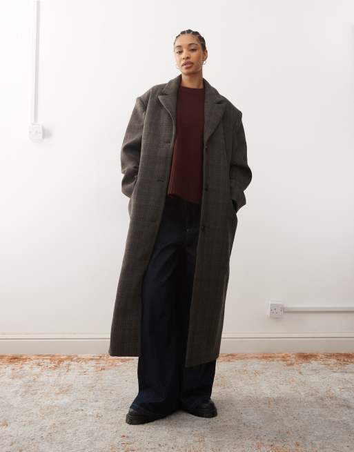 Weekday - Mørk gråbrun oversized frakke med overdrevne skuldre og tern i uldblanding
