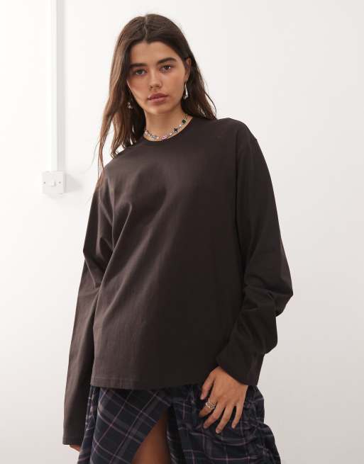 Weekday - Mørkebrun oversized T-shirt med lange ærmer i firkantet pasform