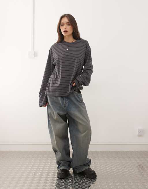 Weekday - Mørkegrå T-shirt med lange ærmer og sorte striber samt firkantet pasform
