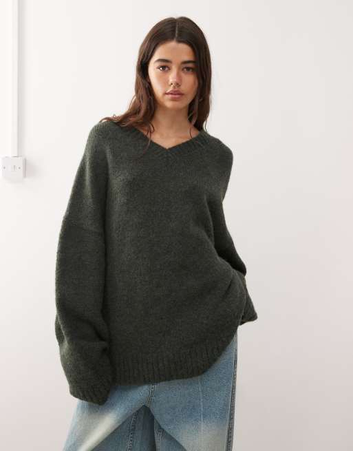 Weekday - Mørkegrøn og meleret samt oversized trøje i uldblanding med V-hals