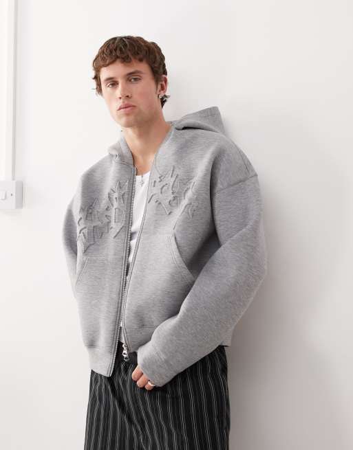Weekday - Simon - Gråmeleret hættetrøje i scuba-stof med lynlås og brodering