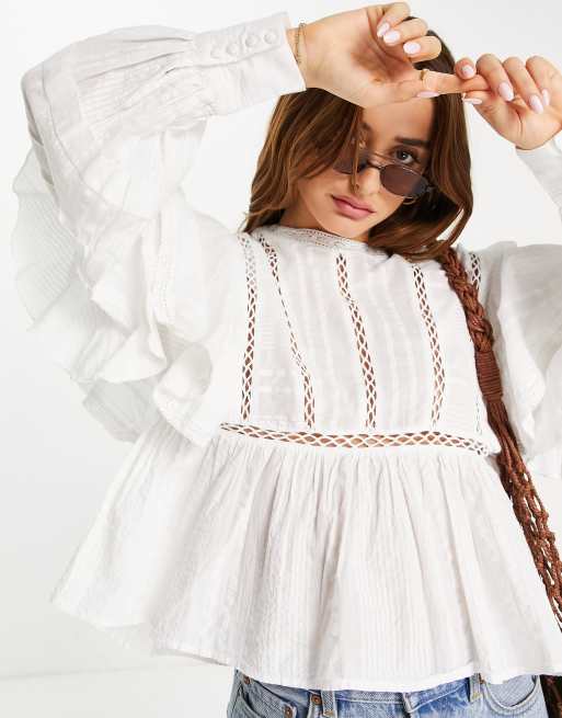 Y.A.S - Højhalset hvid bluse med flæsedetaljer