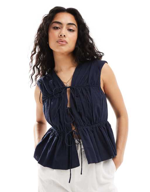 Y.A.S. - Marineblå smock-bluse uden ærmer med bindebånd foran
