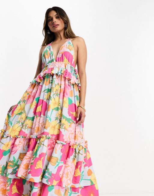 Y.A.S - Maxikjole med halterneck, flæsedetaljer og lyserødt blomstermønster