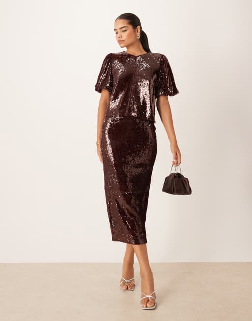 YAS - Premium - Bordeauxrødt sæt med pailletter bestående af midinederdel og top