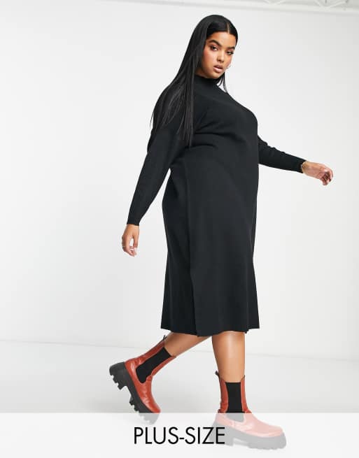 Yours - Ribstrikket langærmet midikjole med slids i siden i sort
