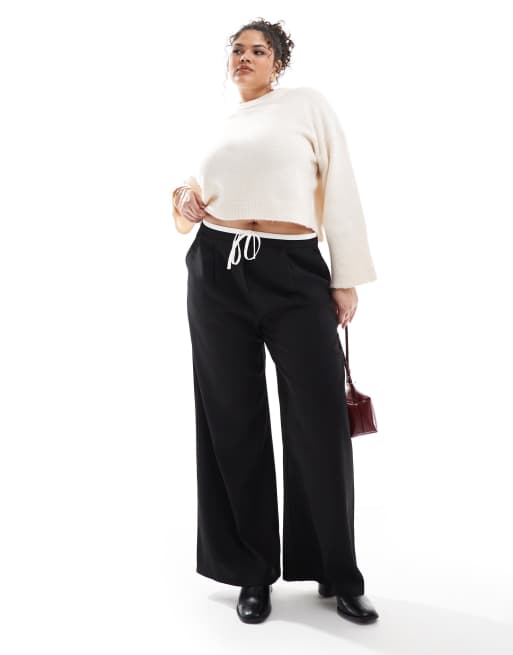Yours - Sorte bukser med vidde og kontrastfarvet talje med løbesnor
