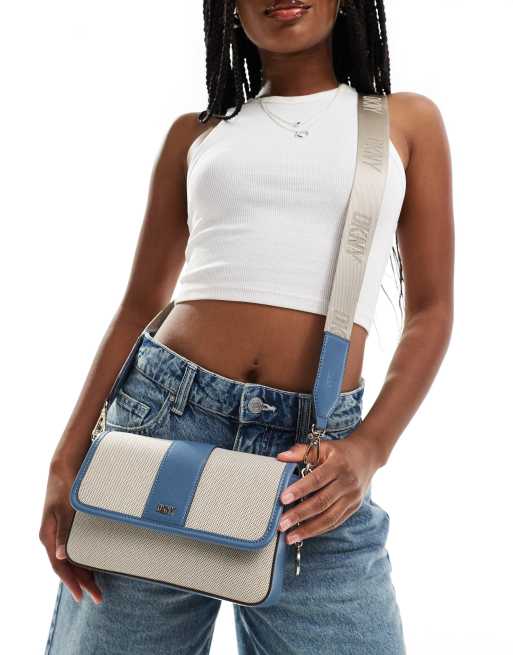 DKNY Bryant leather flap crossbody bag with strap in light blue