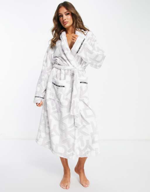 DKNY cosy chenille logo printed long dressing gown in grey/white