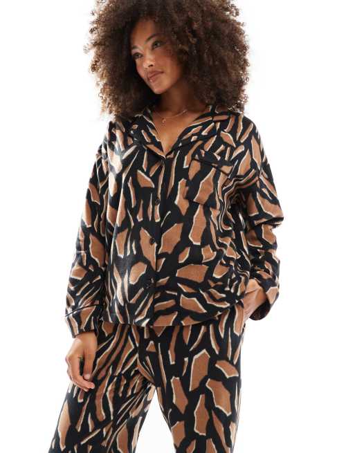 DKNY Folded fleece notch collar pyjama set in black leopard print - BROWN