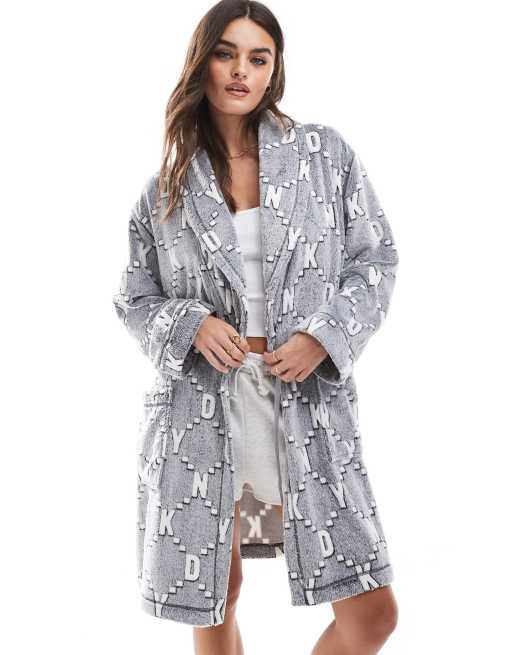 DKNY Folded fleece short chenille robe in frosted grey logo