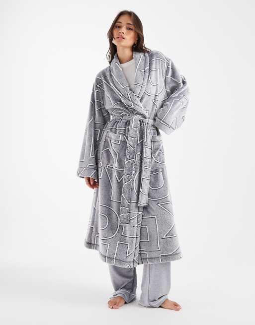 DKNY Folded long robe in frosted grey logo letters
