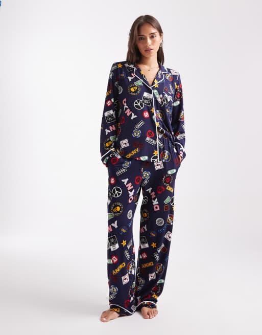 DKNY Folded notch top and pant sleep set in eclipse logo patch