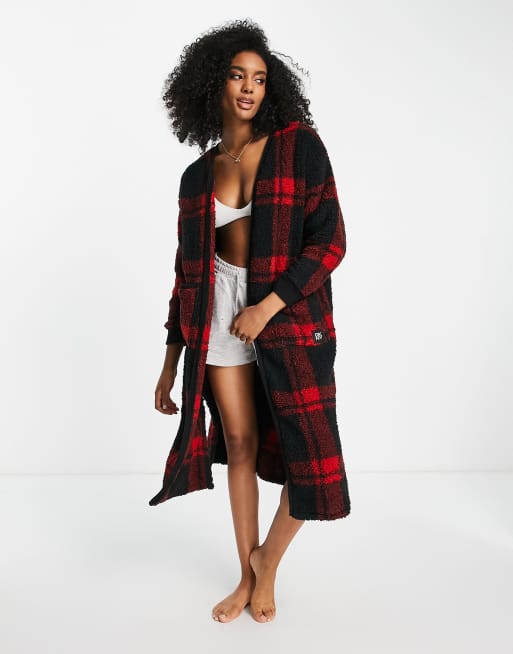 DKNY sherpa long lounge robe in red plaid