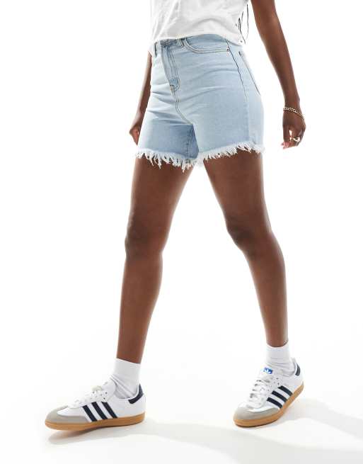 DTT longline denim shorts with raw hem in light blue wash