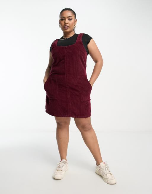 DTT Plus Dawn cord pinafore dress with zip back in burgundy