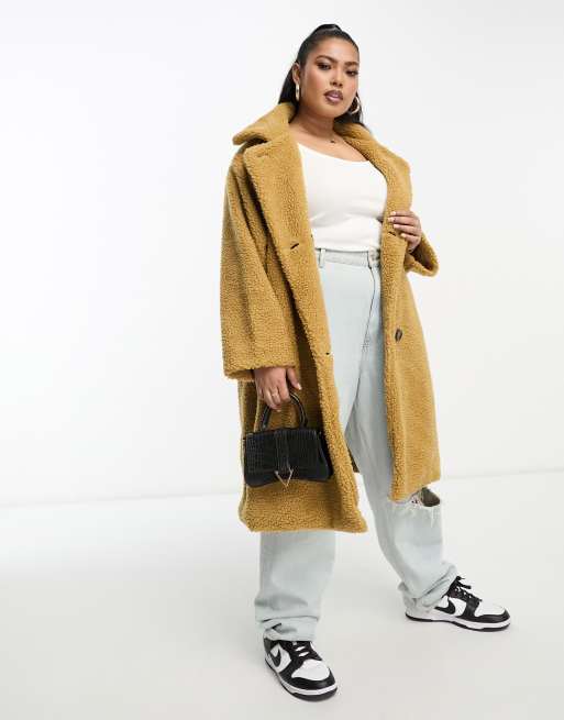 DTT Plus Teddy longline double breasted borg jacket in beige