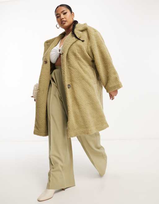 DTT Plus Teddy longline double breasted borg jacket in sage green