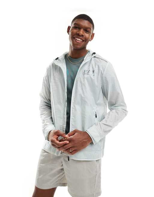 Armani EA7 logo all over geo print transparent hooded windbreaker jacket in light blue