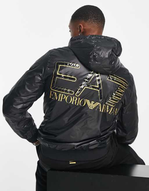 Armani EA7 zip through hooded bomber jacket with back print in black