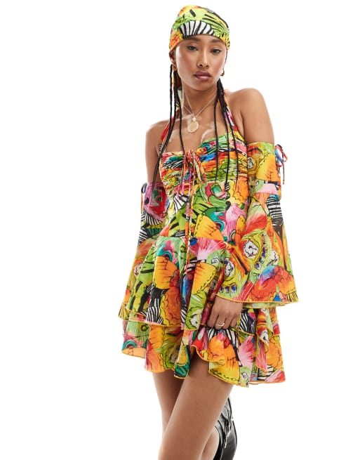 Easy Tiger printed mini dress with sleeves in multi