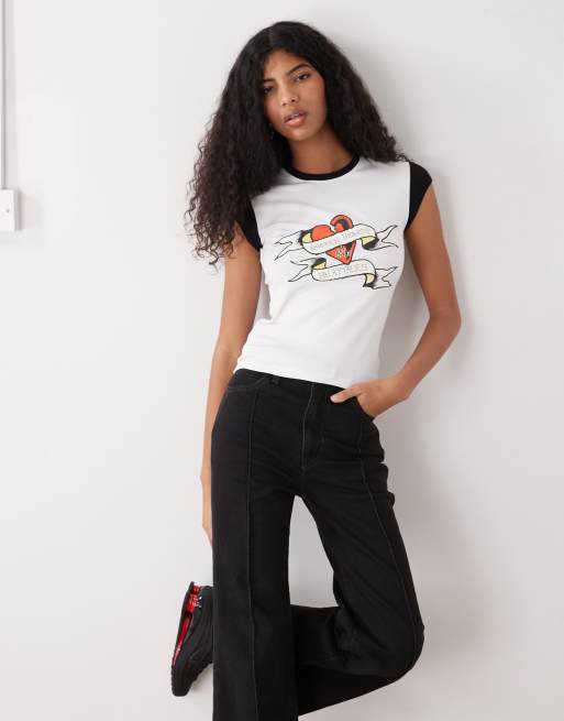 Ed Hardy broken hearts contrast baby tee in white and black