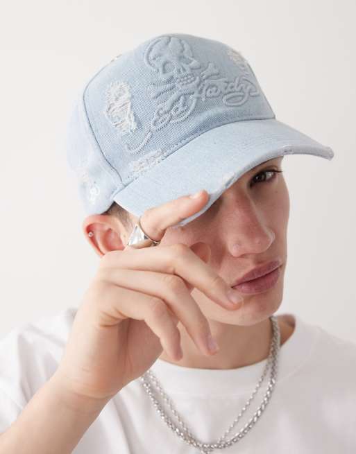 Ed Hardy denim embossed skull 5 panel cap in mid blue