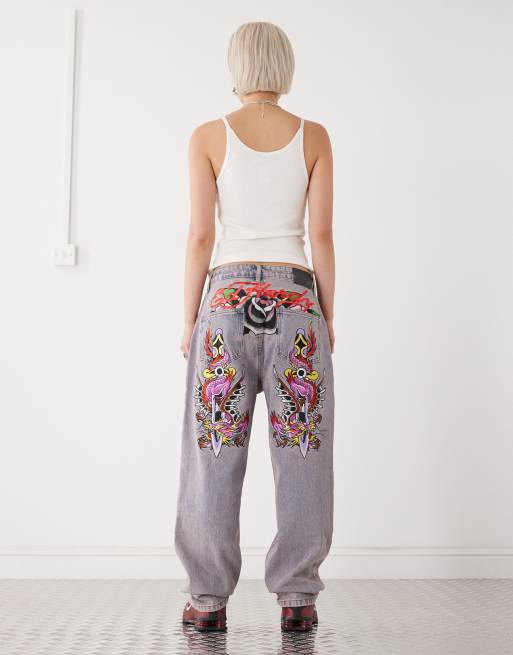 Ed Hardy dragon and sword relaxed denim trousers jeans in purple