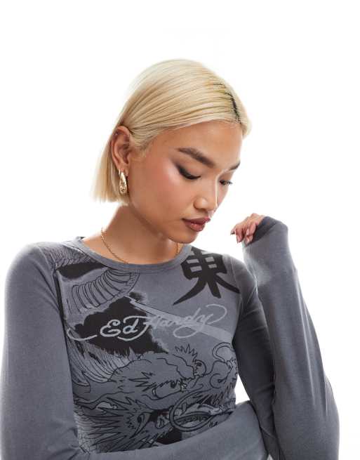 Ed Hardy dragon graphic long sleeve fitted t-shirt in grey
