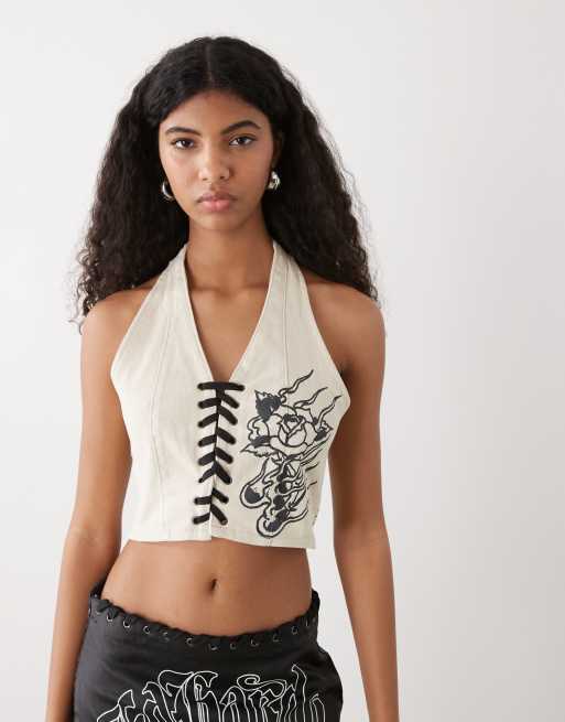 Ed Hardy flaming rose braided denim corset in ecru
