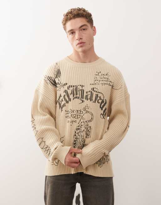 Ed Hardy gothic ribbed knitted crew jumper in beige