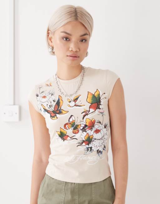 Ed Hardy graphic floral baby tee in sand